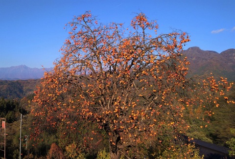 コメント:今年の柿は「豊作」でした。 だからいつも主役のアルプスは雪が無く脇役に。でも、主役の柿を狙ってクマが来る事を、村人は心配していた!