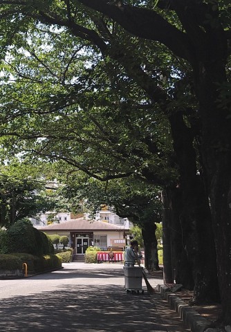 コメント:夏休み!、暑い暑い夏祭り! 「今年限りの桜」の下で清掃員が汗を拭き拭き一休み。トンネルの向こうは担ぎ手を待つ休憩中の子供神輿。 桜も神輿も次世代を期待したい! |