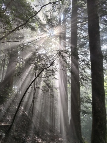 コメント:檜の植林地を登っていると曇り空から朝の光が射してきました。横からの光で、森には水分がかなりあることが分かります。 |