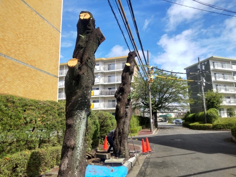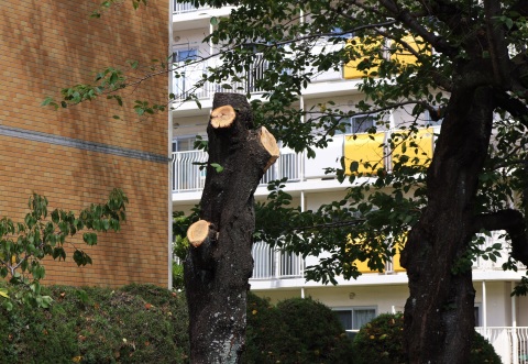 コメント:桜の樹の撤去の途中の、可哀そうな状態のシーンです。枝が全部無くなっています。向こうにはまだ枝葉が残っている樹も見えます。これが無くなると本当に寂しくなります。 |