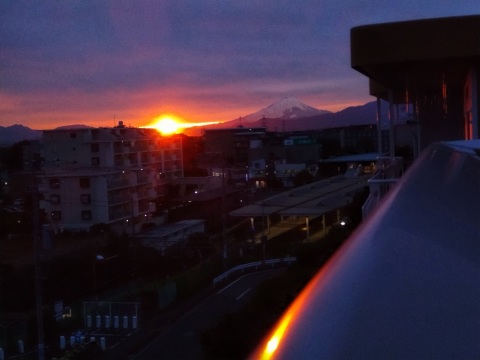 コメント:秋の夕暮れ、赤色の夕日が建物の壁やガラスに反射し、ベランダの手すりはそこが光源であるかのように光っていました。 |