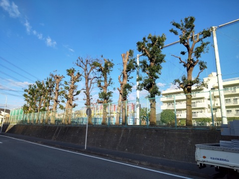 コメント:ウォーキングの途中の小学校の南側の道路を歩いていると、枝葉を落とされて痛々しい姿の樹々を見つけました。この時、頭の中で「どうしてこんなことに・・なにがあったのか・・かわいそうに」と思いました。