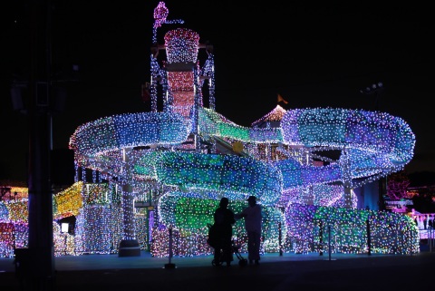 コメント:夕闇の中、子供連れの若いご夫婦が光の中の滑り台前で、楽しそうにスマホで自撮りをし、見せあっている所を写してみました。 |
