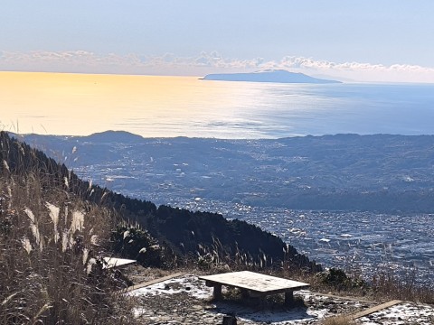 コメント:冬の低い日差しが海を黄色に染めています。眼下は秦野市街、海上に見えているのは大島です。 |