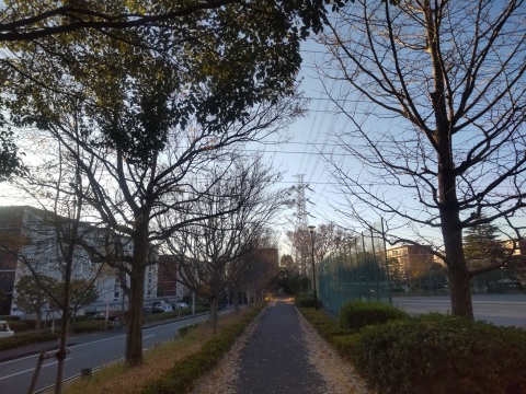 コメント:夕暮れ間近の初冬の遊歩道のシーンです。日陰はすでに薄暗くなって来ています。この道の先の右へのカーブの所に陽が当たっていて僅かに温もりが感じられます。"