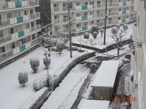 コメント:朝起きてカーテンを開けると、一面の銀世界でした。棟の前のアプローチ通路は、まだ誰も通行してなくて、足跡が全く無い状態だったので、今のうちにと思って直ぐに撮影しました。 |