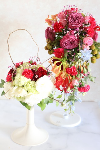 コメント:ブーケホルダーを使って生花でラウンドブーケとキャスケードブーケを作成。ホルダーを使うと制作とお手入れは簡単ですがその反面抜けやすい。作品は室内で自然光で撮るのがベストなのですが部屋が薄暗いとシャッタースピードが遅くなりブレブレになるのでその場合のやり方を知りたいです。